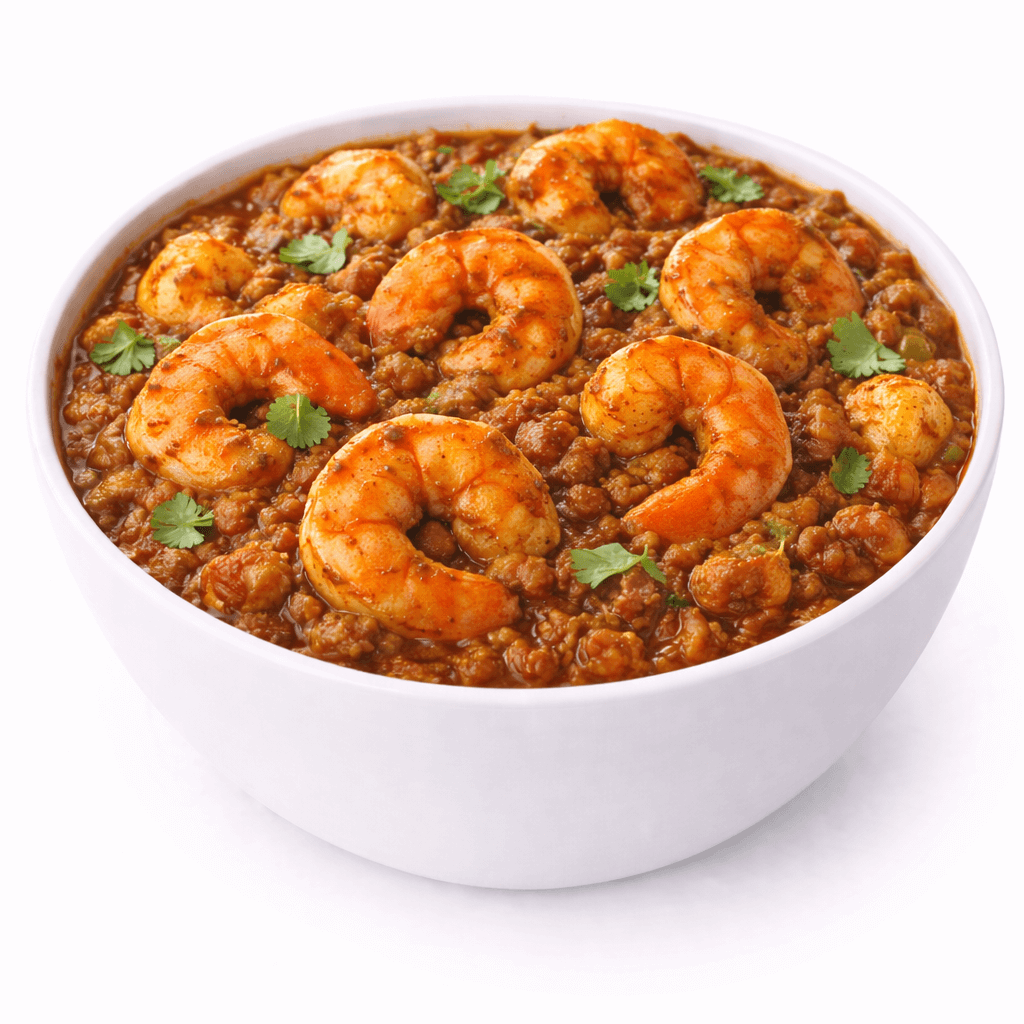 Shrimp prepared in spicy Indian curry sauce and Indian herbs and spices