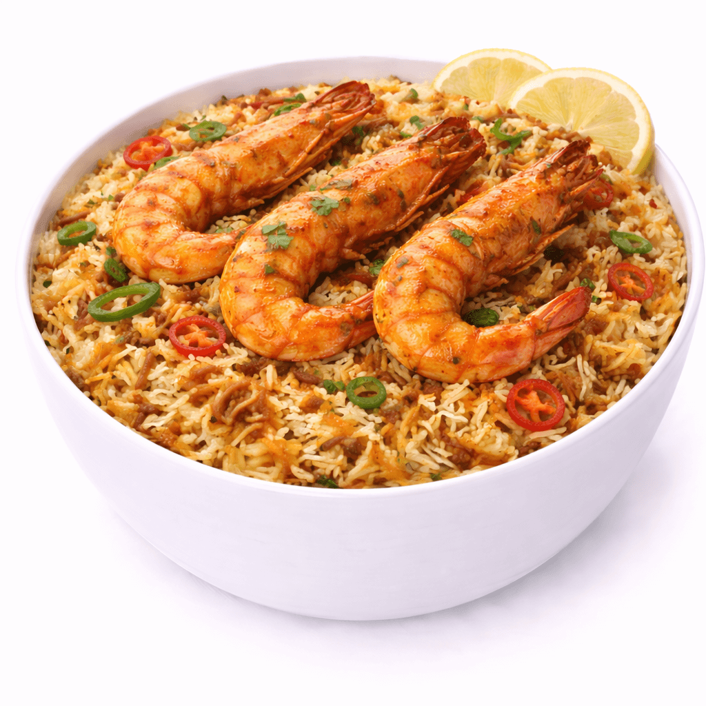 Basmati rice with large shrimps prepared with Indian herbs and spices