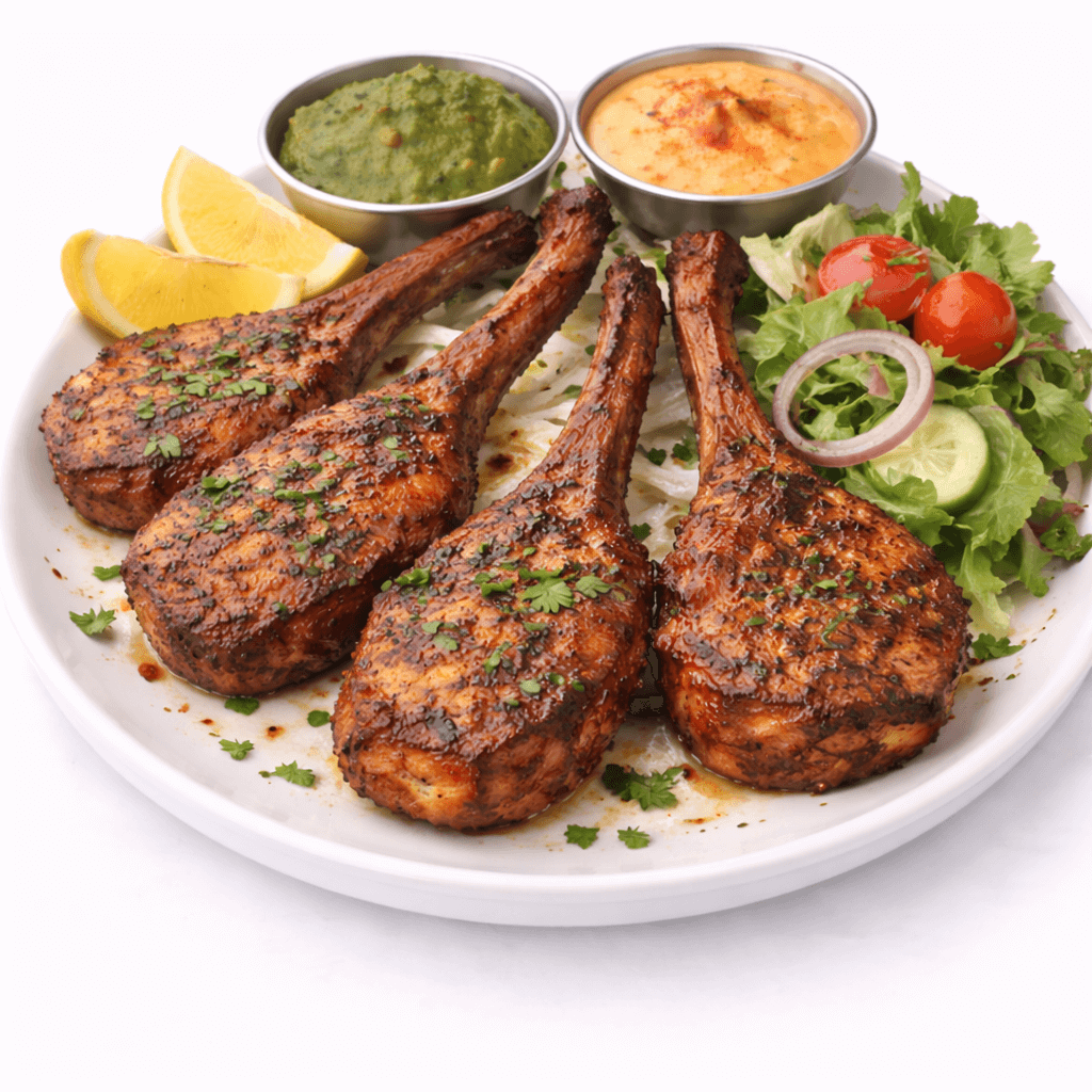 Lamb chops prepared with Indian herbs and spices and marinated in the tandoor clay oven
